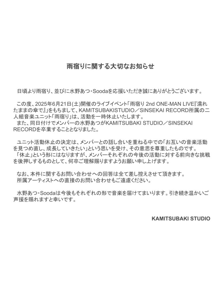 KAMITSUBAKI STUDIO/SINSEKAI RECORD所屬的水野あつ・Sooda的音樂組合「雨宿り」,將於2025年6月21日(六)暫時停止活動。