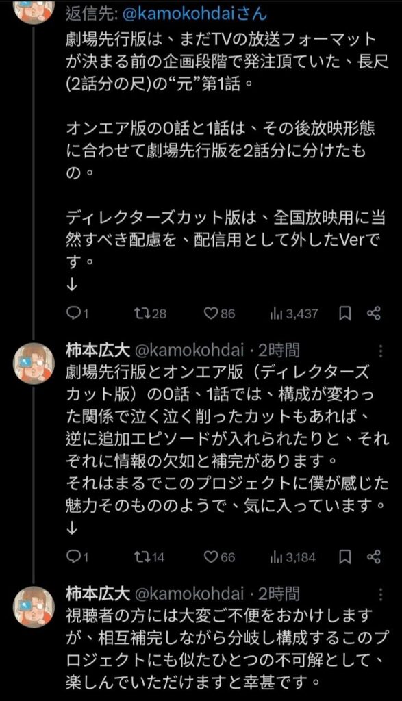 導演剪輯版則是為了全國播出所需的考量,而去掉了配信用部份的版本。