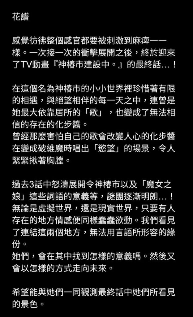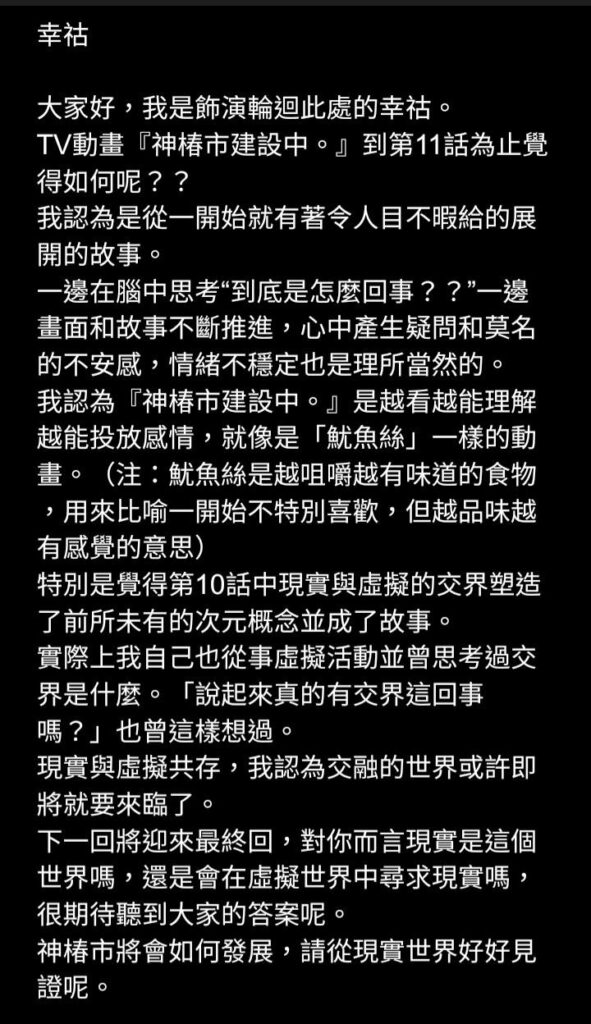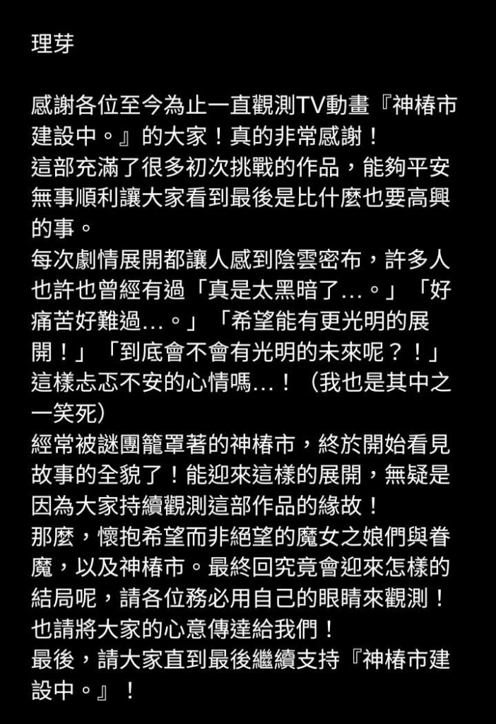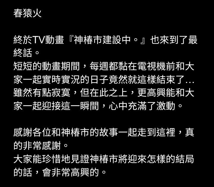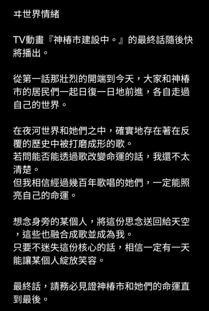 以下是V.W.P成員對於TV動畫「神椿市建設中。」最終回紀念信息…呃最終回!?還是今晚!?
