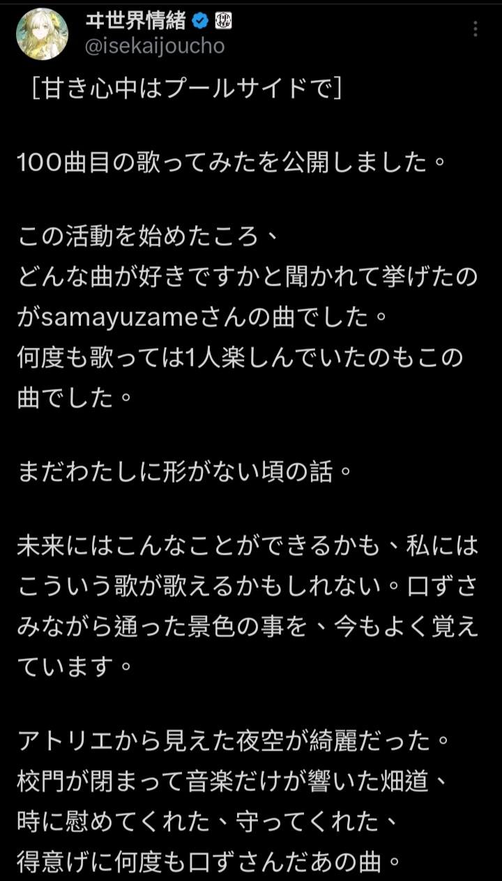 —————————————— [甘美的殉情在泳池邊] 第100首翻唱曲公開了。 在開始活動的時候, 當被問到喜 … 閱讀全文